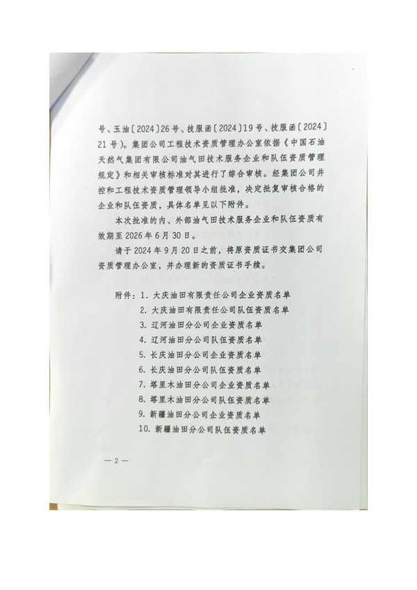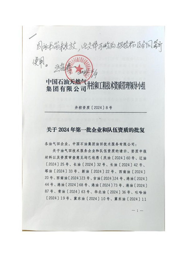 中石油“關(guān)于2024年第一批企業(yè)和隊伍資質(zhì)的批復(fù)”文件