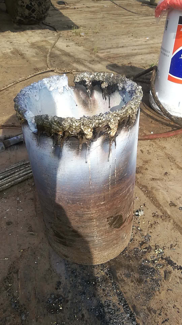1、施工目的:取套。 2、施工前狀況:管外漏。 3、施工后要達(dá)到的目標(biāo):試壓21兆帕,壓力15分鐘,壓力不降為合格。 4、計(jì)劃的施工程序:通井,確定井內(nèi)人工井底位置,套內(nèi)是否有變型和落物,驗(yàn)漏,確定漏點(diǎn)位置,下機(jī)械丟手,套銑。 5、*前面的圖片是自制的銑頭。